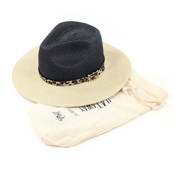 This hat features Animal print band. The hat has a cream brim and black top.. It's the perfect companion for sunny days, combining style, practicality, and eco-friendly design.