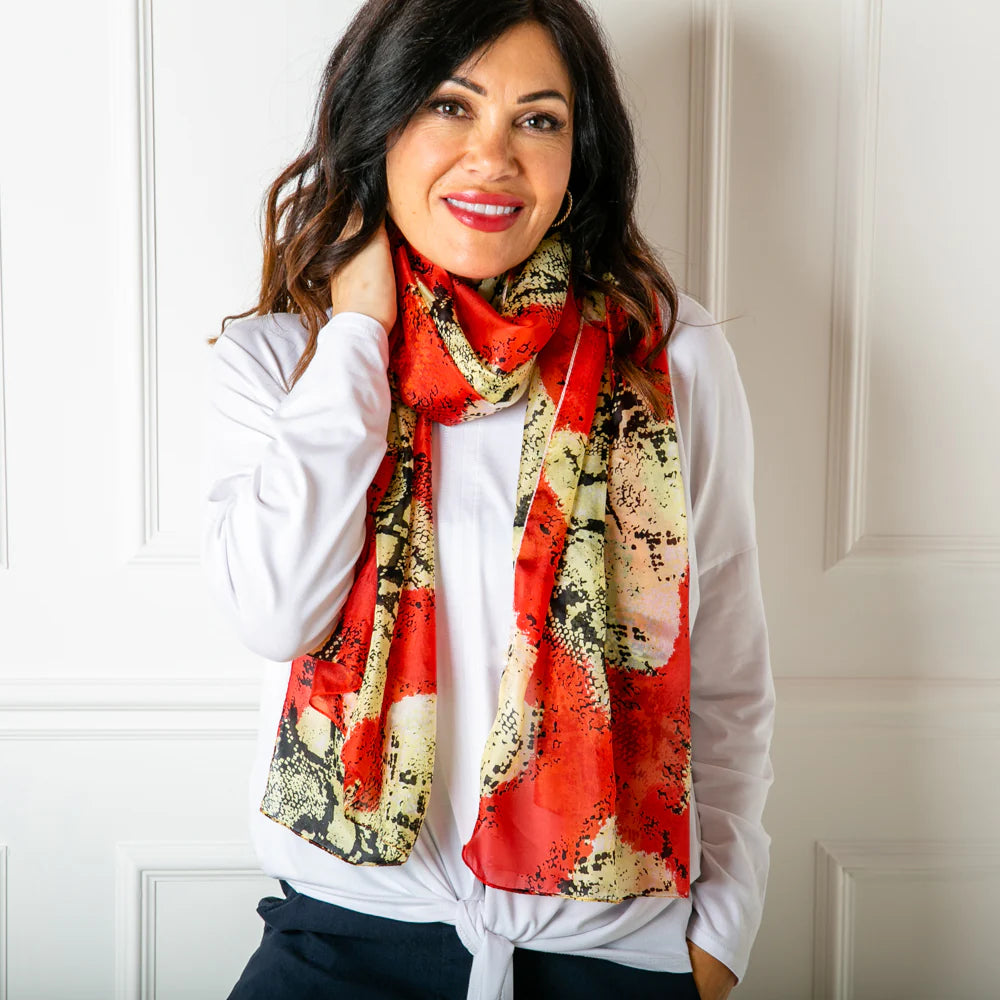 Stand out with this vibrant Red Snake Print Silk Scarf by Tilley & Grace! The bold colors and unique pattern make for a truly eye-catching accessory. Made with 100% luxury silk. This scarf is perfect for making a statement. Measuring approximately 170cm by 110cm, it's the perfect size for adding a pop of personality to any outfit.